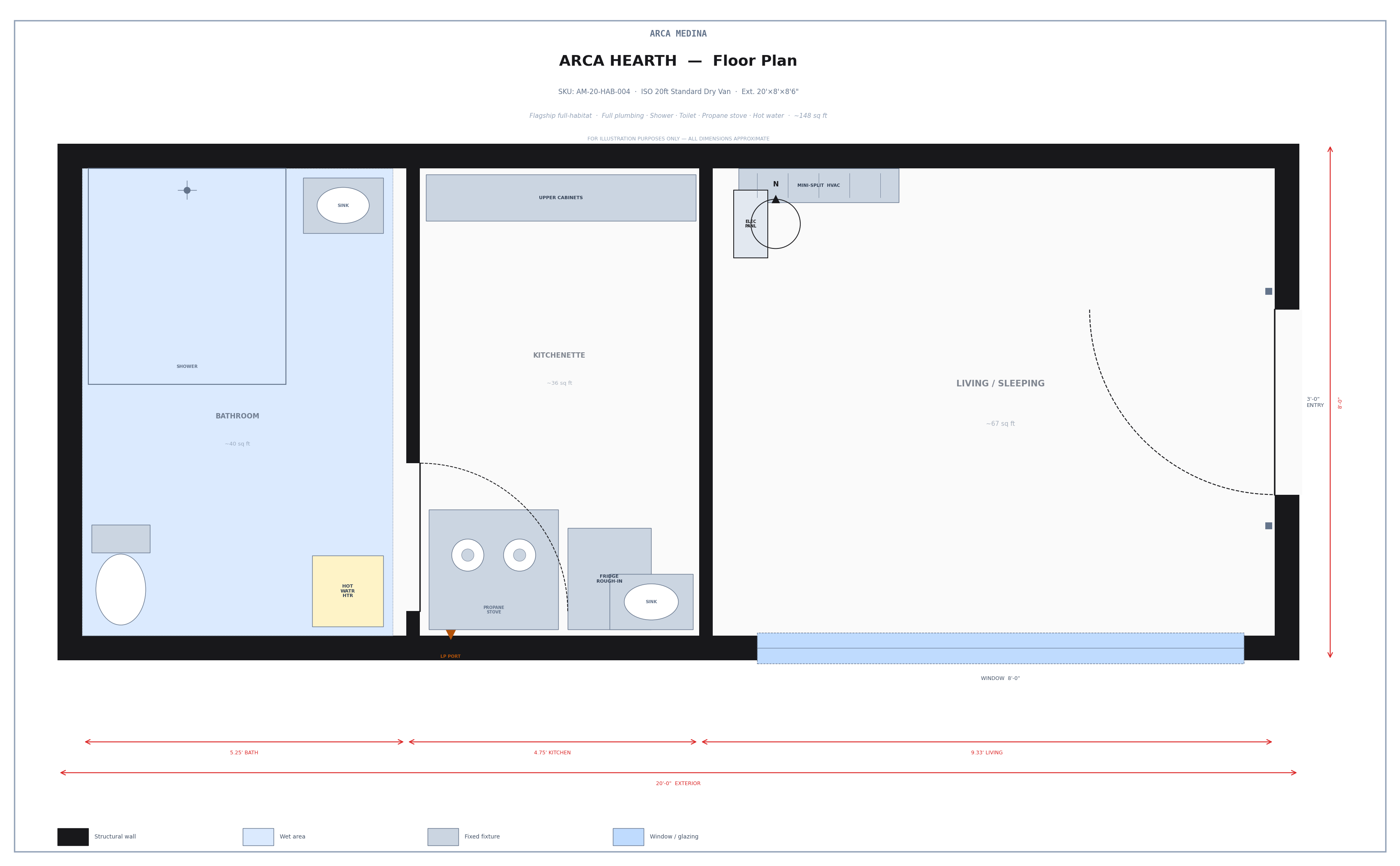 The ARCA HEARTH is Arca Medina's flagship deployable habitat: a fully plumbed, gas-powered living unit built inside an ISO 20 ft Standard Dry Van container. Unlike other ARCA units that prioritize power independence, the HEARTH is engineered around one thing: living.