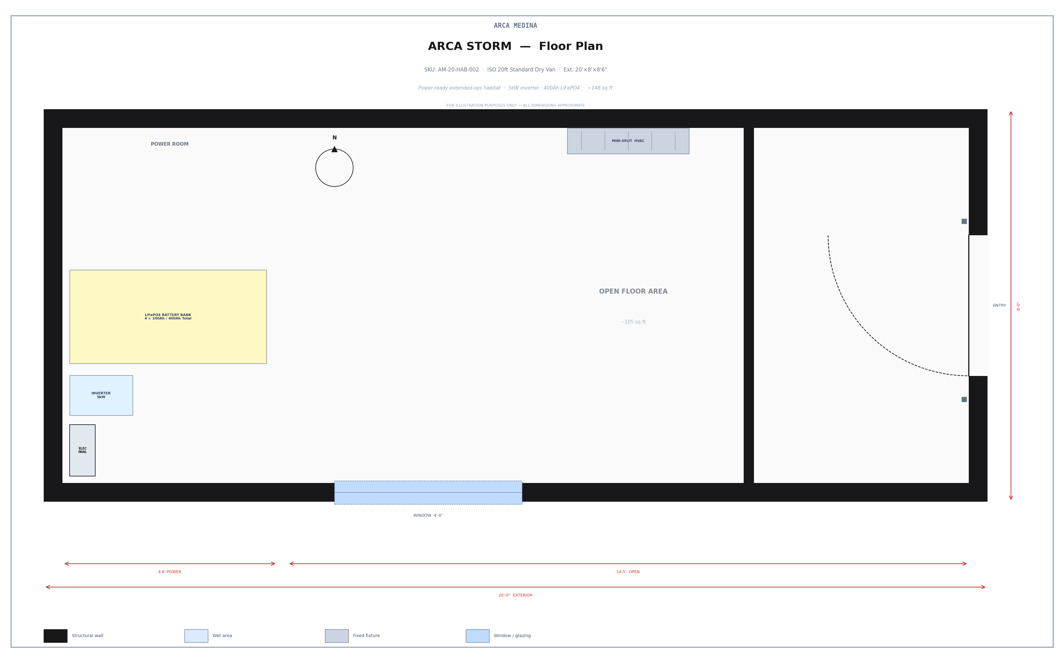 ARCA STORM is the power-upgraded tier of the Arca Medina 20ft Deployable Habitat Unit — built for extended off-grid operations where energy independence is non-negotiable. Every STORM unit ships with a high-performance PVC composite interior panel system replacing standard OSB, paired with an expanded LiFePO4 battery bank and an upgraded 10kW solar-hybrid inverter.